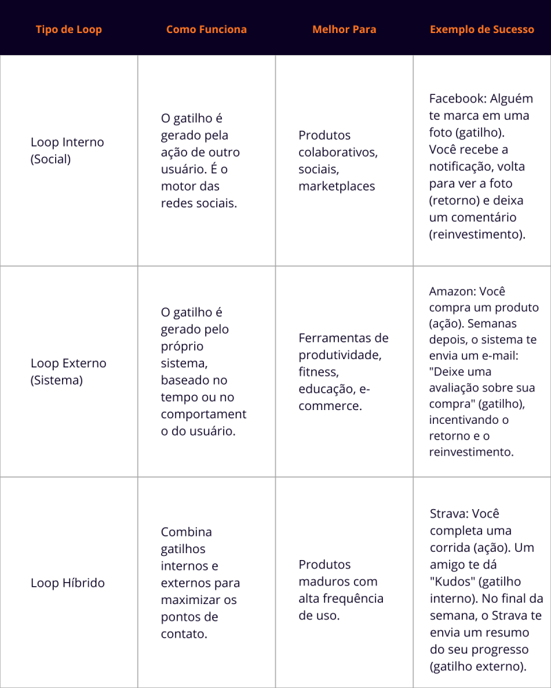 Loops de engajamento podem ser classificados com base na origem do gatilho. A escolha depende da natureza social e da frequência de uso do seu produto.